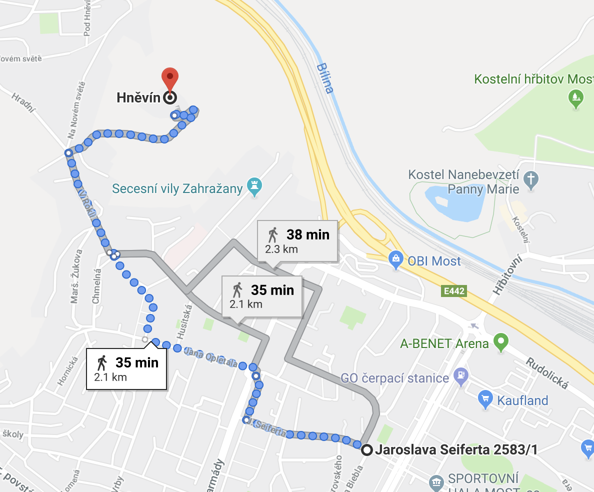 Last year, I had a chance to visit Český Krumlov in the South of the Czech Republic where my parents were living. Since my visit, they have relocated to the north of the country and as I had a laid-back day where we did not have many activities planned, I decided to explore the city called Most in the north of the Czech Republic where they are living now. Luckily, I did not have to look for activities for a long time – 25 minutes walk from their place, there was a Gothic castle called Hněvín so we decided to “climb that goddamn mountain” (wink, wink, there is a sneaky Jack Kerouac reference here!). The map of our walk looked like this: