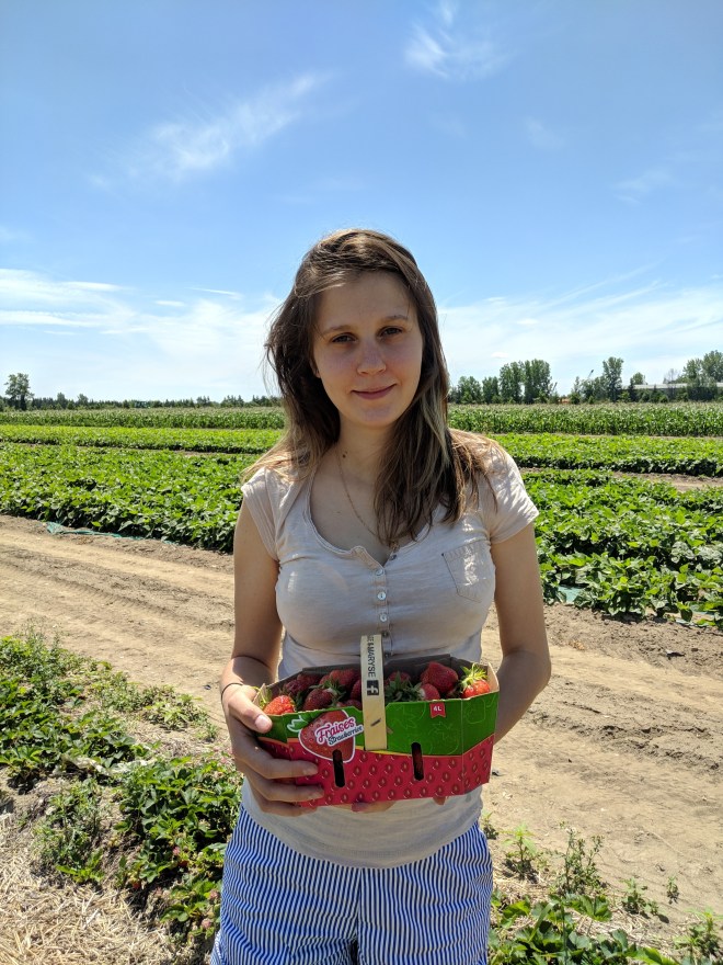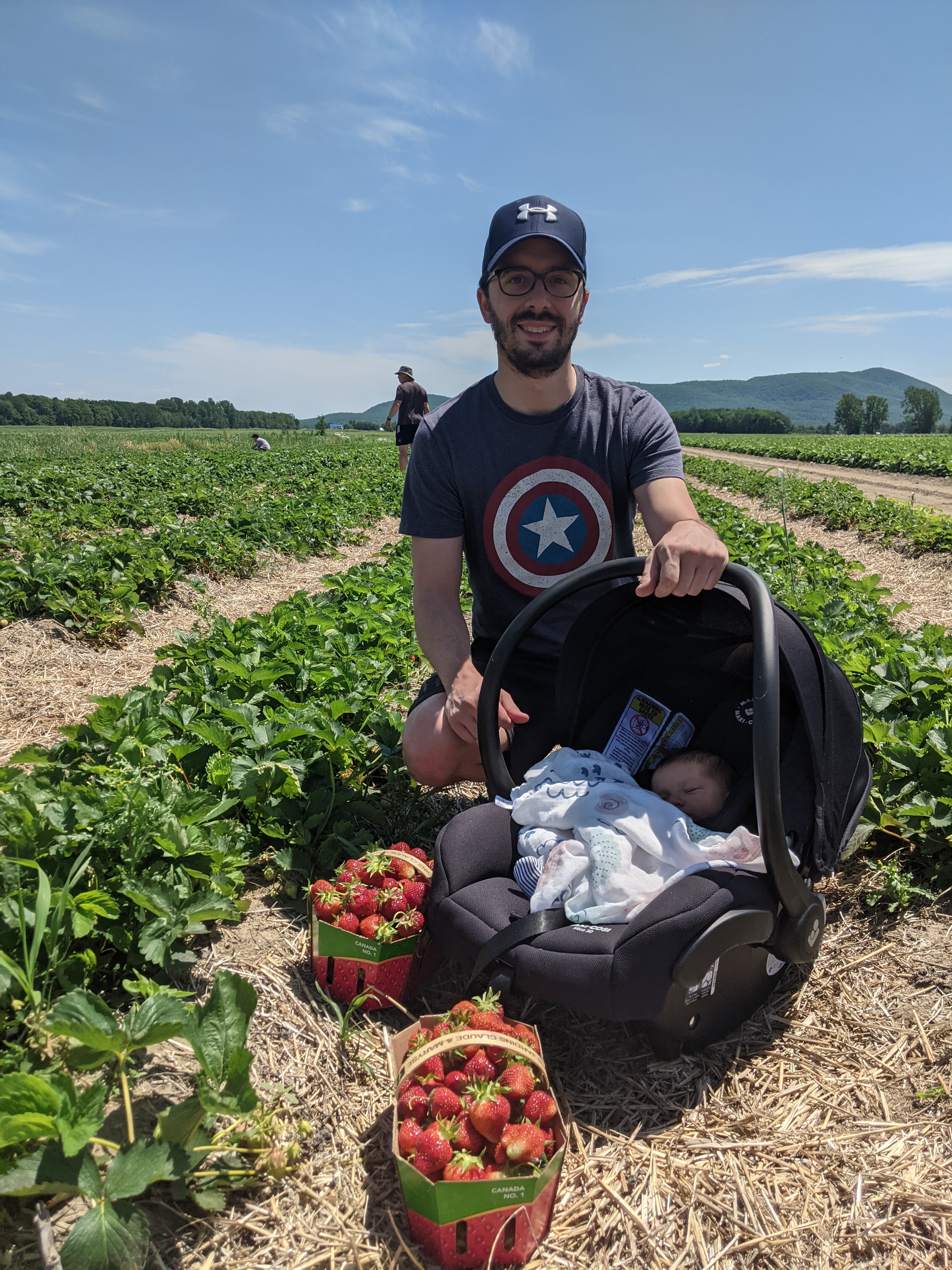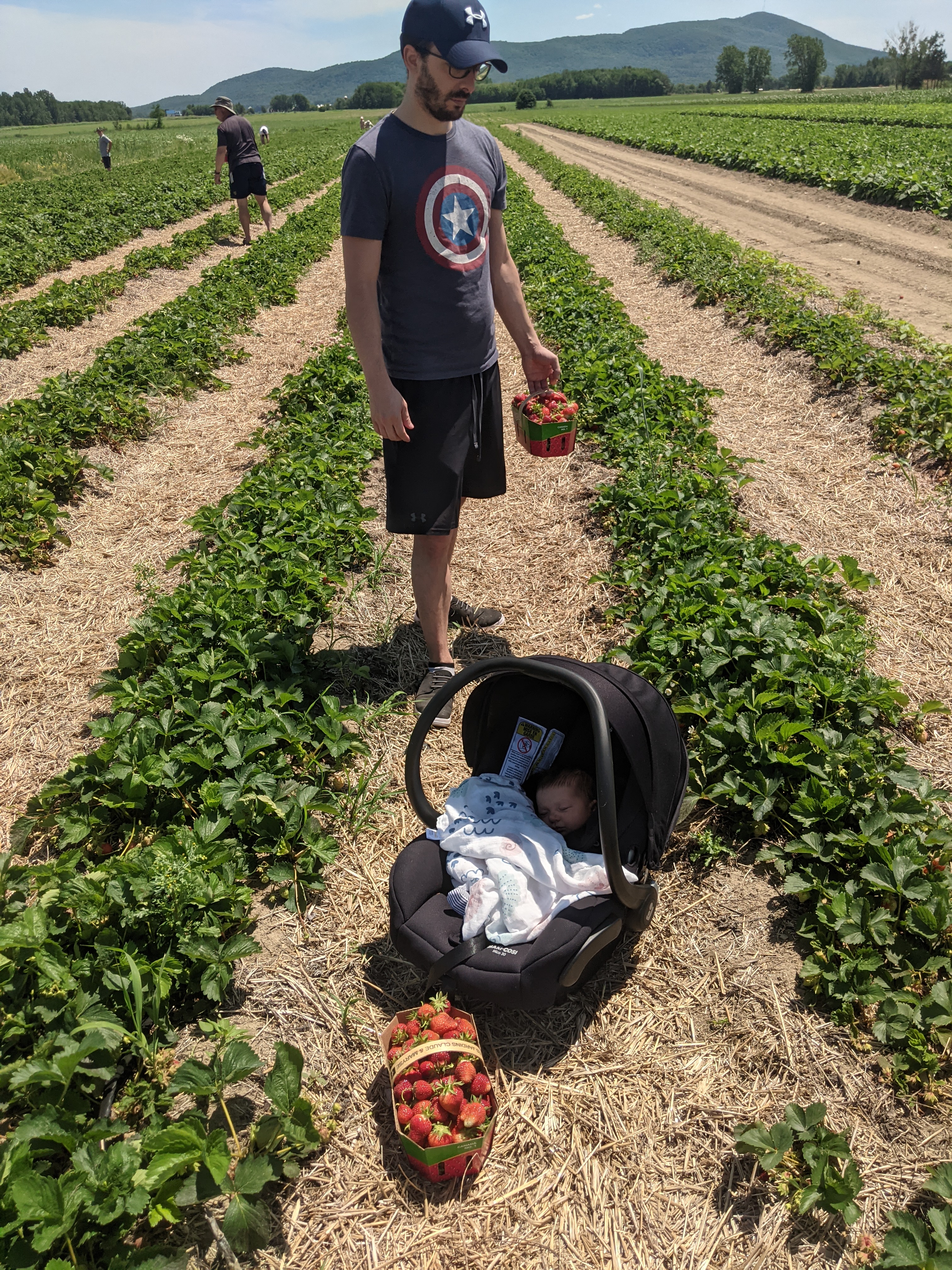 This spring has been exceptionally warm in Quebec which means that we have the local strawberry ready much earlier than usual. In the few last year, it would be at the end of June but this year around June 10, the fields were open for picking – this meant I had to go but I also have a one month old baby which meant she had to go with me.